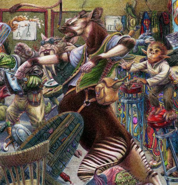 artwork in pieces and stitching those pieces back together. In the case of the barroom brawl, I did the second