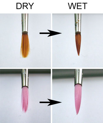 - Synthetic: The synthetic bristles seem to be of a more consistent quality than natural hair so that, even if not as nice as natural hair, I know what I'm getting. They don't seem to fall out nearly as much as natural hair and they seem to retain their properties better over time. I'm not basing this on any scientific study; just personal experience. They also seem to work better with the synthetic acrylic paints. And natural hair that gives my desired springiness (see below) run a lot higher in cost.