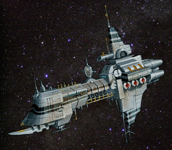 Artist Comments: "Scout Ship" was made in late 2004 for Sabertooth Game's WarHammer 40,000: Horus Heresy collectible card game. The original piece has a halo of black around it but otherwise does not have a background. I was told that Sabertooth would add a background, though I have not seen it yet. I added the starfield from the NASA image site.